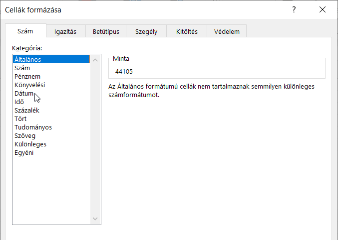 A számformátumok beállításához jelöljük ki a cellákat és használjuk a Kezdőlap Szám csoportját. Itt olvashatjuk le azt, hogy a kijelölt cellákban szereplő értékeknek mi a számformátuma. Akapesetben Általános, vagyis az értékeken semmilyen formátum nincs.